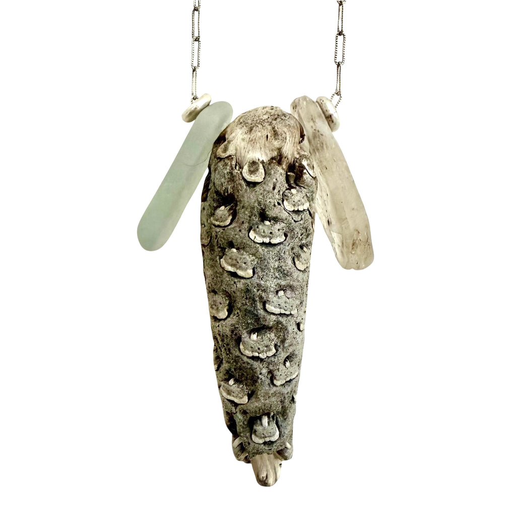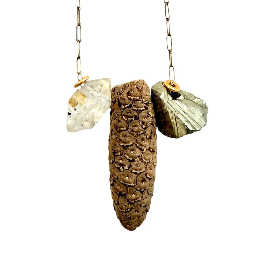 Driftwood Pine Cone + Pyrite + Quartz Necklace