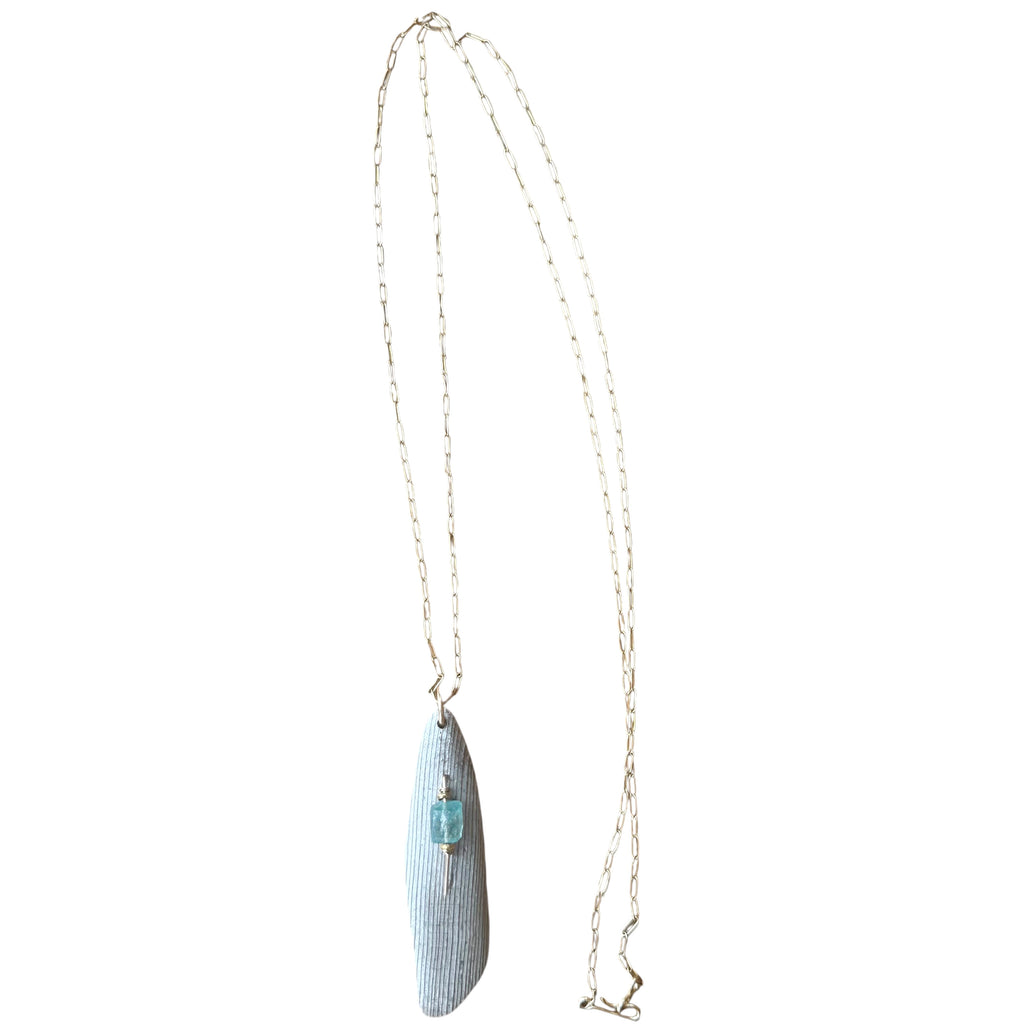 This beautiful long piece of driftwood has a slight white washed look with dramatic grain patterns. A bright blue Apatite stone picks up on the grain patterns and color. This long necklace is finished with gold chain.