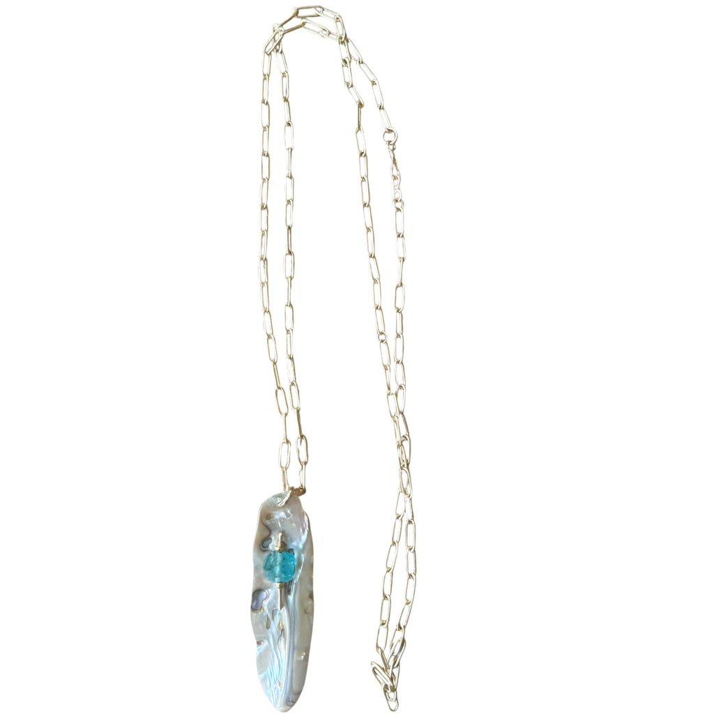 This stunning piece of Abalone with its blue and pink tones is paired with a large blue Apatite stone. Gold, gold vermeil beads & large paper clip gold chain complete the design.